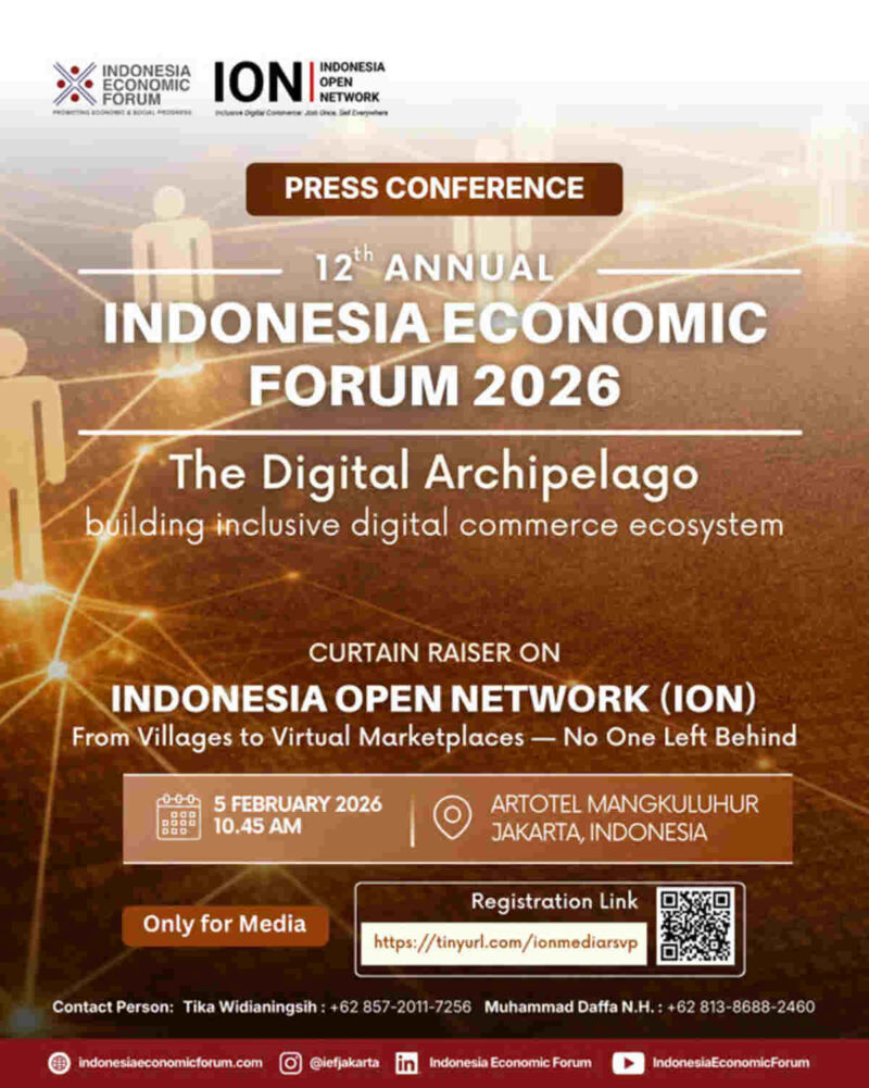Jakarta, Indonesia — 27 Januari 2026 Indonesia Economic Forum (IEF) akan menyelenggarakan Curtain Raiser Indonesia Open Network (ION) pada Kamis, 5 Februari 2026, bertempat di Mangkuluhur ARTOTEL Jakarta, Tiara Ballroom Lantai 3. Kegiatan ini menjadi pembuka rangkaian Indonesia Economic Forum ke-12 yang mengusung tema “The Digital Archipelago: Building Inclusive Digital Commerce Ecosystem.”