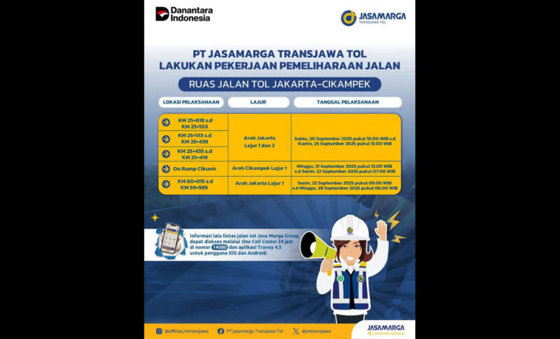 Sebagai bagian dari komitmen dalam menjaga kualitas layanan tetap optimal bagi pengguna jalan tol, PT Jasamarga Transjawa Tol (JTT) kembali melaksanakan pekerjaan pemeliharaan di Ruas Tol Jakarta–Cikampek. Senior Manager Representative Office 1 JTT, Amri Sanusi, menjelaskan bahwa pekerjaan rekonstruksi dilaksanakan berdasarkan hasil evaluasi kondisi lapangan. “Pekerjaan akan berlangsung selama sepekan di tiga titik utama, yaitu KM 25, KM 60, dan On Ramp, mulai Sabtu, 20 September 2025 hingga Minggu, 28 September 2025. Selama periode tersebut, operasional Tol Jakarta–Cikampek tetap berjalan normal di kedua arah,” terangnya. Adapun rincian tanggal dan lokasi pekerjaan di Ruas Jalan Tol Jakarta-Cikampek sebagai berikut: 1. Sabtu (20/09) pukul 10.00 WIB s.d Kamis (25/09) pukul 15.00 WIB terdapat rekonstruksi jalan di KM 25+618 s.d KM 25+553, KM 25+513 s.d KM 25+438 dan KM 25+435 s.d KM 25+419 arah Jakarta lajur 1 dan 2 2. Minggu (21/09) pukul 13.00 WIB s.d Senin (22/09) pukul 07.00 WIB terdapat rekonstruksi jalan di On Ramp Cikunir arah Cikampek lajur 1 3. Senin (22/09) pukul 09.00 WIB s.d Minggu (28/09) pukul 06.00 WIB terdapat rekonstruksi jalan di KM 60+015 s.d KM 59+995 arah Jakarta lajur 1 Untuk mendukung kelancaran informasi, JTT telah melakukan sosialisasi melalui spanduk imbauan dan penyampaian pesan pada Dynamic Message Sign (DMS) di ruas Tol Jakarta–Cikampek, baik arah Jakarta maupun Cikampek. Vice President Corporate Secretary & Legal JTT, Ria Marlinda Paallo, menambahkan bahwa perusahaan telah menyiapkan langkah mitigasi untuk menjaga kelancaran arus lalu lintas. “Sebagai informasi, saat ini masih terdapat pekerjaan perbaikan yang berlangsung hingga 21 September 2025. Dengan demikian, terdapat beberapa titik pekerjaan secara bersamaan di Ruas Tol Jakarta–Cikampek. Hal ini merupakan bagian dari langkah antisipasi sekaligus wujud komitmen JTT dalam menjaga kualitas jalan agar layanan tetap optimal bagi seluruh pengguna tol. Untuk itu, kami menempatkan petugas di lapangan, menata arus kendaraan di sekitar area pekerjaan, mempersempit ruang kerja, serta menyiapkan rekayasa lalu lintas contraflow bila diperlukan. Koordinasi intensif juga terus dilakukan bersama PJR,” ujar Ria. Ria turut menyampaikan permohonan maaf kepada pengguna jalan. “Kami memohon maaf atas ketidaknyamanan yang mungkin timbul selama pekerjaan berlangsung. Kami juga mengimbau pengguna jalan untuk selalu mengutamakan keselamatan dengan memastikan kondisi kendaraan prima, saldo uang elektronik mencukupi, bahan bakar serta daya perangkat terisi penuh, dan tetap mematuhi rambu lalu lintas, khususnya di sekitar lokasi pekerjaan,” tutupnya. Informasi lalu lintas jalan tol Jasa Marga Group dapat diakses melalui One Call Center 24 jam di nomor 14080 dan aplikasi Travoy 4.5 untuk pengguna iOS dan Android.